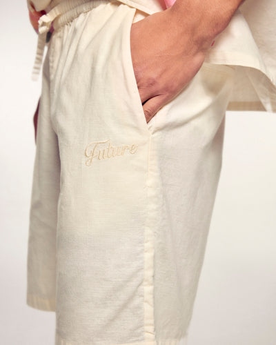 Diese Shorts sind ein unverzichtbares Element der Sommergarderobe und setzen auf absoluten Komfort und einen lässigen Stil. Sie sind aus einer leichten Mischung aus Leinen und Baumwolle gefertigt und verfügen über eine Regular-Passform mit elastischem Bund und Kordelzug für eine ideale Passform. Sie zeichnen sich durch unseren „Future“-Schriftzug aus, der dezent im Plattstich an der Seite aufgestickt ist und diesem unverzichtbaren Kleidungsstück ein gepflegtes Finish verleiht.