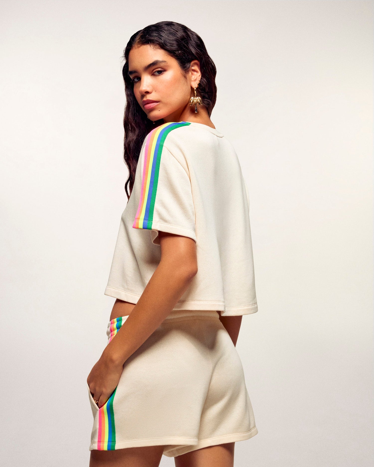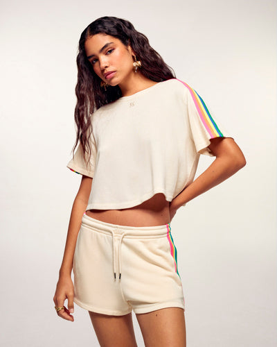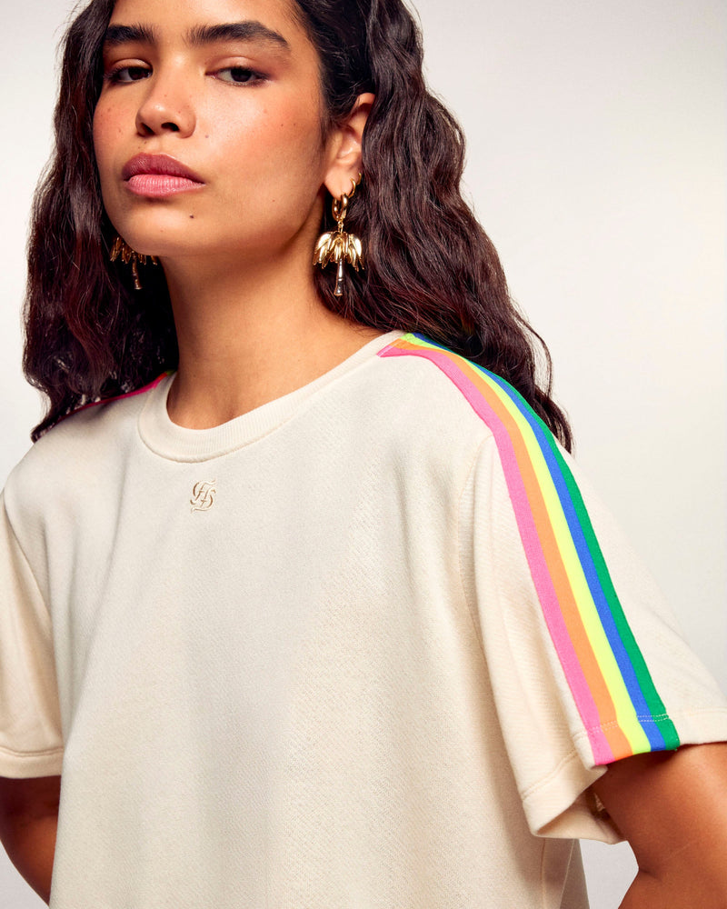 Eine grafische und moderne Silhouette für dieses kurze T-Shirt, eine wahre Ikone der Marke. Gefertigt aus einer fließenden Mischung aus Modal und Baumwolle, zeigt es die charakteristischen bunten Ringel auf den Schultern und ein besticktes „FF“-Logo in der Mitte. Ein unverzichtbares Stück, das absoluten Komfort mit urbaner Ausstrahlung verbindet.