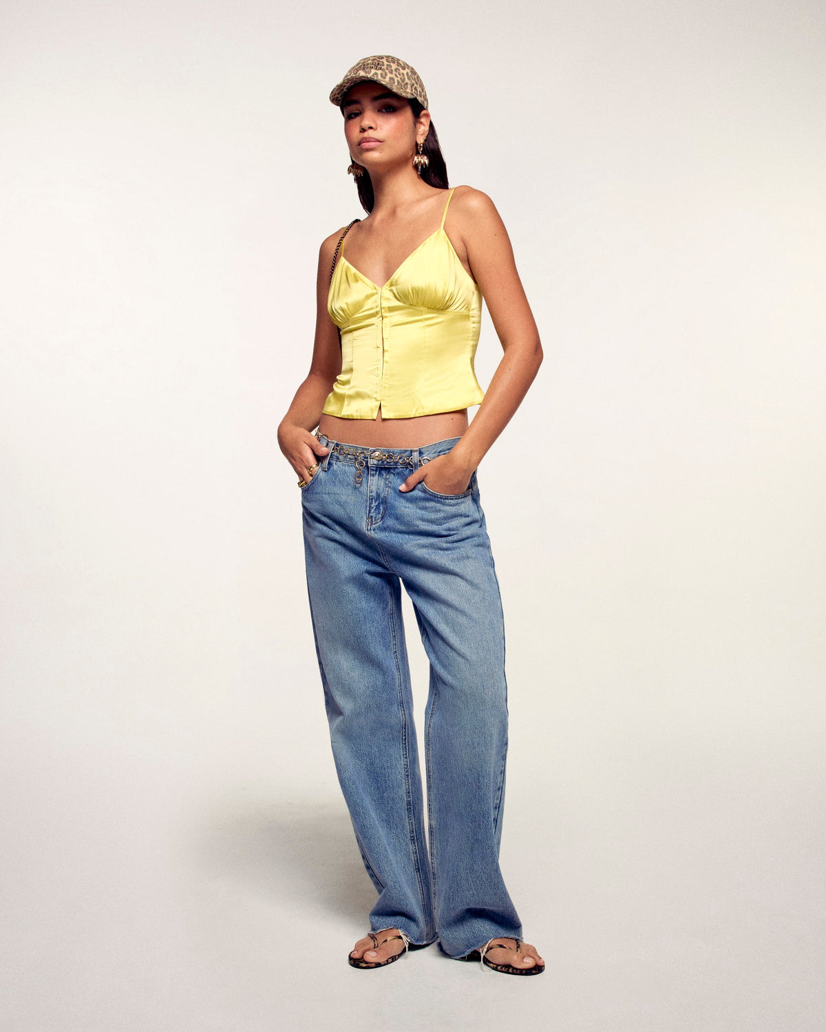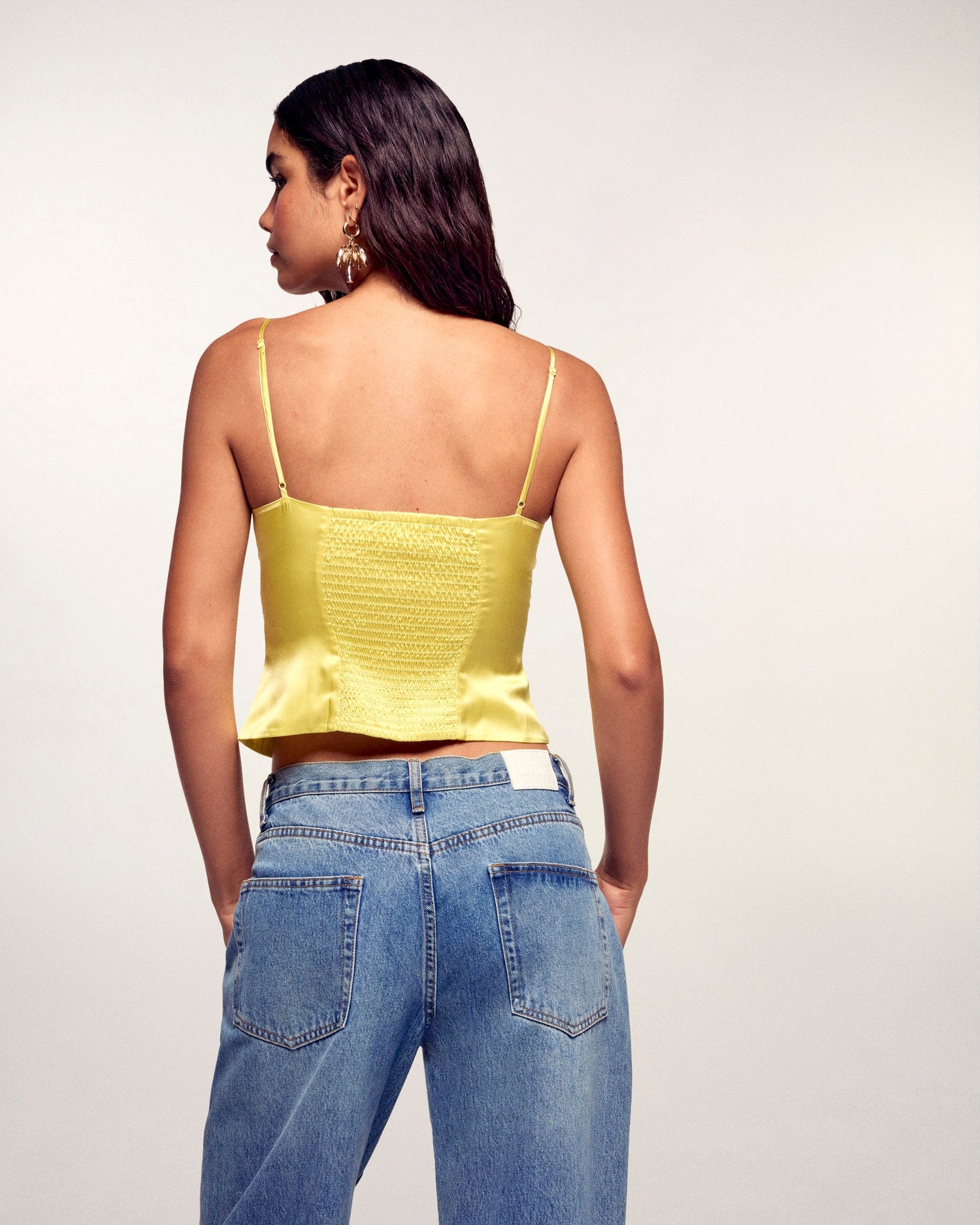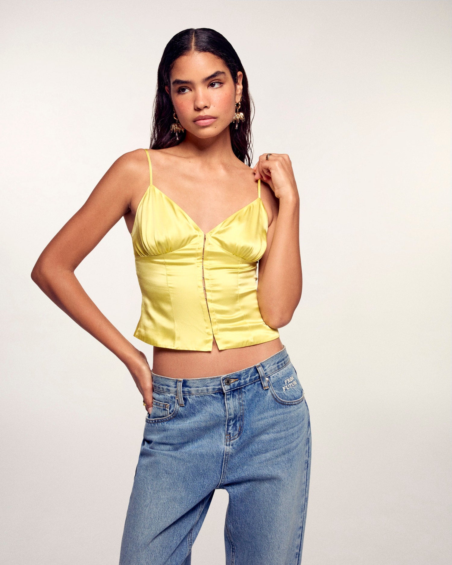 Ein charakterstarkes Stück mit Couture-Akzenten, das die Silhouette mit Eleganz strukturiert. Dieses Top aus Seidensatin besticht durch seine Raffungen an der Brust und seine mit Hakenverschlüssen verzierte Vorderöffnung, die für einen ebenso anspruchsvollen wie modernen Look sorgt.