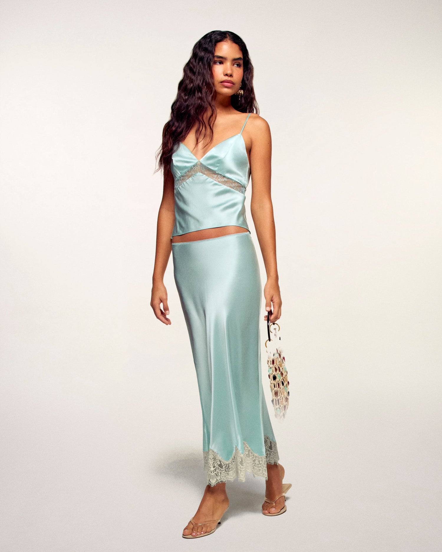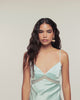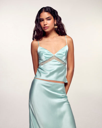 Ein Spiel mit der Transparenz bei diesem kurzen Top aus leichtem und seidigem Seidensatin. Ausgestattet mit schmalen, verstellbaren Trägern, besticht es durch einen V-Ausschnitt und Spitzenbänder. Elegant und vielseitig lässt es sich ideal mit einer Anzughose oder einem fließenden Rock kombinieren.